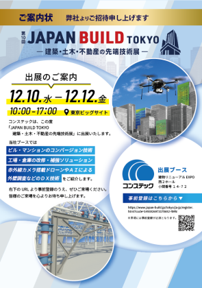 展示会 リーフレット Japan Build TOKYO 出展のご案内 プレビュー ダウンロード 会社紹介 このエリアのカタログを一括ダウンロード コンステック プレビュー ダウンロード 調査・診断 このエリアのカタログを一括ダウンロード 目視調査DX CONS-FINDER【SKY】 プレビュー ダウンロード 目視調査DX CONS-FINDER【4G】 プレビュー ダウンロード 振動計測 ~建物の揺れ方調査~ プレビュー ダウンロード MULCO 迅速自然電位法 ~RC造の鉄筋腐食調査~ プレビュー ダウンロード 形状・寸法記録 プレビュー ダウンロード 赤外線調査 プレビュー ダウンロード 厚さ・深さ推定 プレビュー ダウンロード コンクリート内の埋設物探査 プレビュー ダウンロード コンクリートの表層品質評価 プレビュー ダウンロード 既設コンクリートの物性調査【圧縮強度試験、中性化深さ試験】 プレビュー ダウンロード 狭隘部点検 プレビュー ダウンロード 補修・改修 このエリアのカタログを一括ダウンロード 建造物の長寿命化対策のご提案 プレビュー ダウンロード B-Star工法 ~レンガ造建造物の補強~ プレビュー ダウンロード コンステックの歴史的建造物の施工例 プレビュー ダウンロード 歴史的建造物調査 プレビュー ダウンロード 【総合】アスベスト対策 プレビュー ダウンロード AGバブルシステム ~石綿含有外壁塗材除去工法~ プレビュー ダウンロード リアネットE工法 ~外壁防水補修改修工法~ プレビュー ダウンロード コンスネット工法 ~セメント系外壁複合改修工法~ プレビュー ダウンロード シェルトクリヤ~中性化抑制クリヤ材~ プレビュー ダウンロード EPC耐火モルタル~耐火性能に優れるポリマーセメントモルタル~ プレビュー ダウンロード 土木構造物の改修 タフネスコート工法 プレビュー ダウンロード ERP鉄筋防錆工法 プレビュー ダウンロード 土木構造物の改修 スワエール工法 プレビュー ダウンロード 土木構造物の改修 ASフォーム プレビュー ダウンロード デンカリノテック再アルカリ化工法 プレビュー ダウンロード デンカリノテック再アルカリ化工法 プレビュー ダウンロード リアルーフ工法 ~様々な屋根に適用可能な防水工法~ プレビュー ダウンロード ビトグラウト ~地下擁壁等の漏水止水工法~ プレビュー ダウンロード SOSEI(工場屋根の延命化) プレビュー ダウンロード リムテクト工法 プレビュー ダウンロード 構造ソリューション このエリアのカタログを一括ダウンロード テイラーフルード粘性ダンパ- プレビュー ダウンロード VESダンパー(ヴェス) プレビュー ダウンロード トグル制震構法 プレビュー ダウンロード C-Wood座屈拘束ブレースシステム(シーウッド) プレビュー ダウンロード ブレース補強 KTブレース プレビュー ダウンロード 鉄骨造工場・倉庫の耐震診断・耐震改修 プレビュー ダウンロード SpS工法(エスピーエス) プレビュー ダウンロード アドジョイント工法 プレビュー ダウンロード 鉄骨造用耐震補強工法 耐震ケーブルブレース プレビュー ダウンロード eプレート工法 ~既存梁・スラブの曲げ補強~ プレビュー ダウンロード 間接接合工法 ディスクシアキー工法 プレビュー ダウンロード リダブル工法 ~既存梁のあと抜き開孔補強~ プレビュー ダウンロード 連続繊維補強 SR-CF工法 プレビュー ダウンロード 連続繊維補強 CFRP波形定着工法 プレビュー ダウンロード C-VaRTMブレース接合部補強 プレビュー ダウンロード C-VaRTMブレース鋼材補修 プレビュー ダウンロード 間接接合工法 鋼管コッター工法 プレビュー ダウンロード 外付けフレーム補強 デザインUフレーム工法 プレビュー ダウンロード e-アンカー プレビュー ダウンロード 外付けフレーム補強 Portal Grid工法 プレビュー ダウンロード ハイパーロック工法 ~PC板外壁建物向け外付け補強~ プレビュー ダウンロード ファインビュー工法 プレビュー ダウンロード ブレース補強 ハイブリッド耐震補強工法 プレビュー ダウンロード ノンピック工法 プレビュー ダウンロード ブロック壁補強 安震ブロック プレビュー ダウンロード