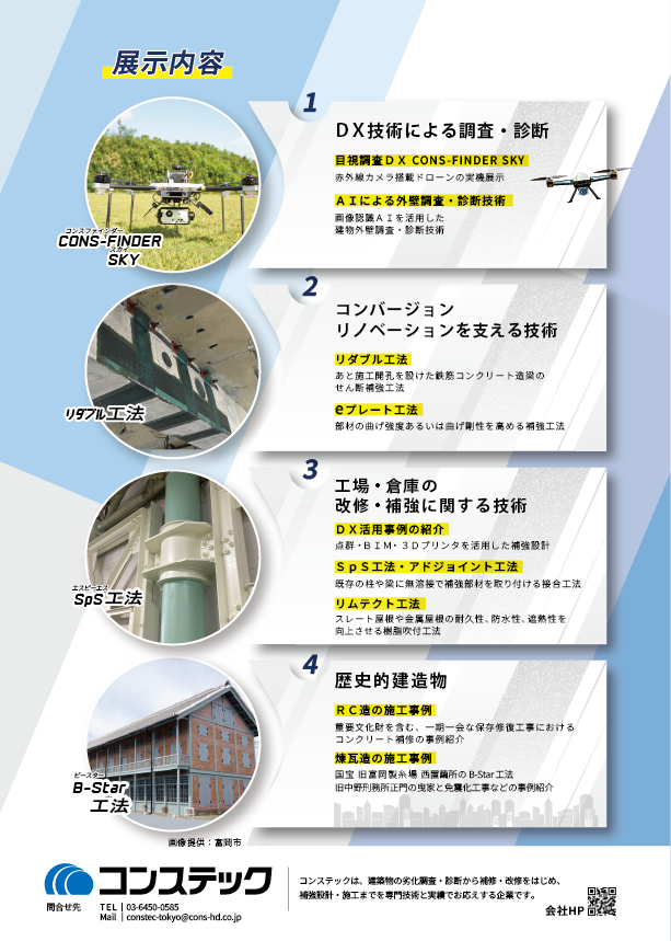 会場では、ビル・マンションのコンバージョン技術や工場・倉庫の改修・補強ソリューション、赤外線カメラ搭載ドローンやAIによる外壁調査などの