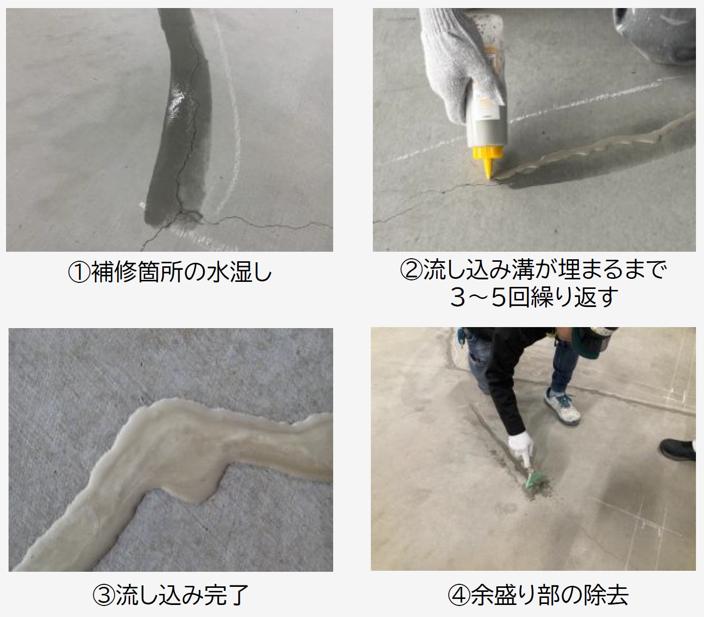 ポウルリペア工法の特長として、無機系材料を用いた流し込み施工のため、ひび割れ部の清掃から施工完了まで約1日と短工期であることから休業期間を短くすることが可能です。さらに、施工中の人の往来を確保しやすく、騒音の小ささや臭気が発生しないことから部分的に操業している施設等でも適用しやすい工法です。