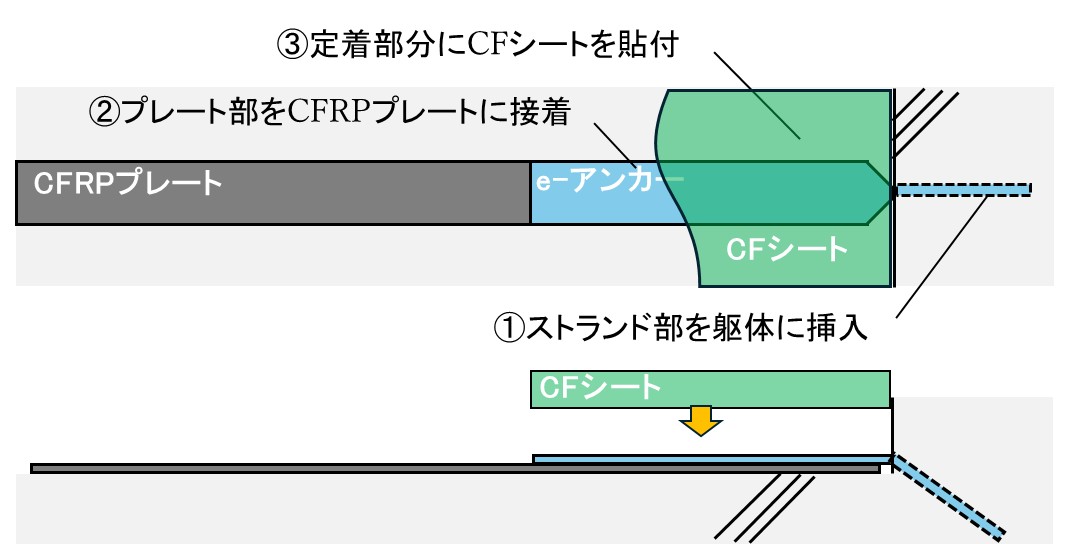 eプレート工法の端部をe-アンカーにより固定することで、必要付着長さを確保した場合と同様の定着効果が得られることを実験により確認しております。