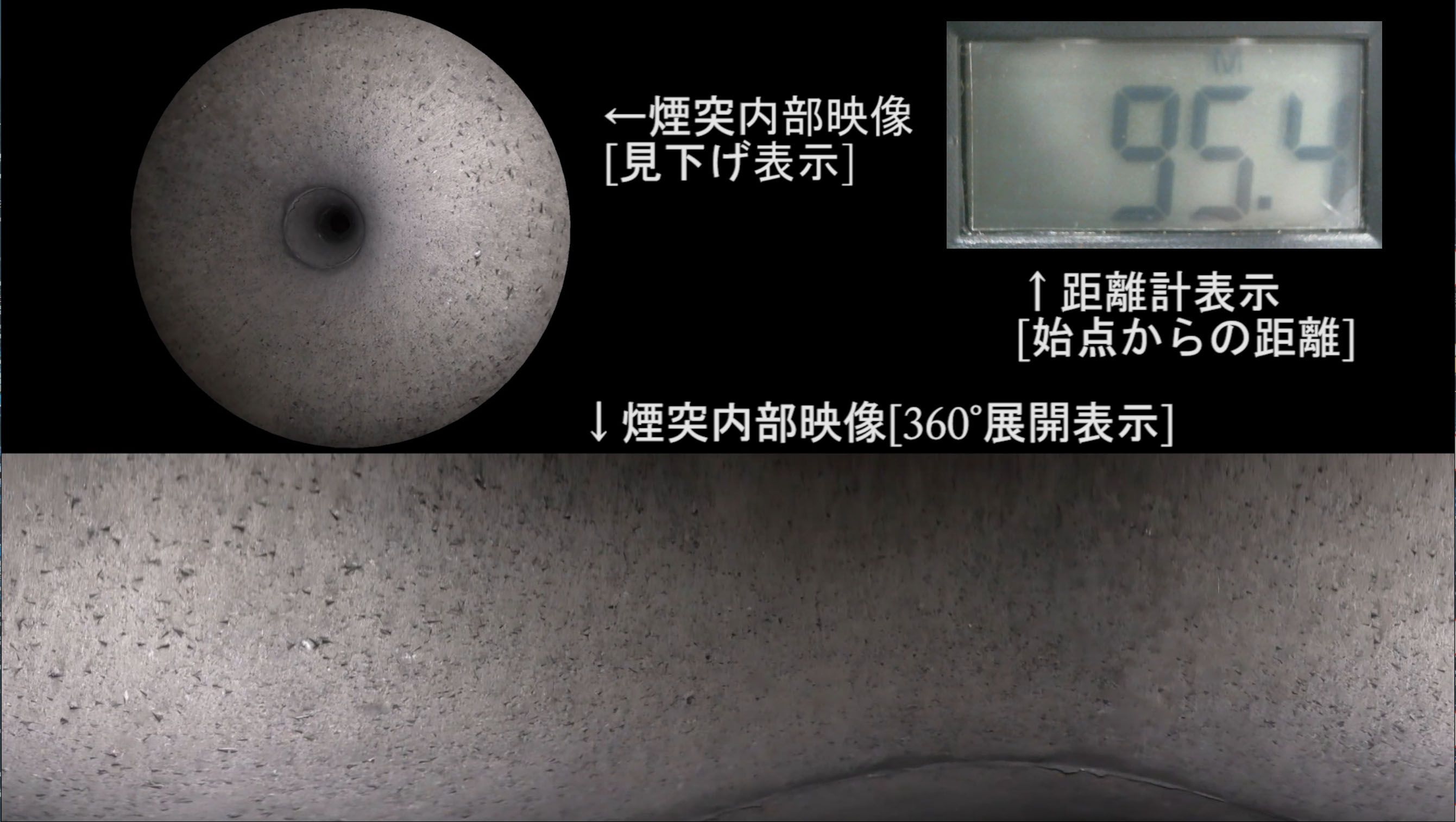煙突の内部点検調査について、当社は独自開発した撮影装置を用いて、安全・迅速に調査を行います。視野の広い半天球カメラの映像と距離情報を紐付けて煙突内部の状況を把握します。装置は小型で電源内蔵のため外部電源は不要であり、仮設を省略することができます。