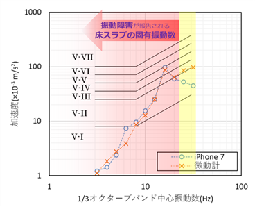 iPhone内臓の加速度センサを利用しています。高感度微動計との実験による感度確認の結果、振動数25Hzまでであれば精度良く評価できることを確認しております。
